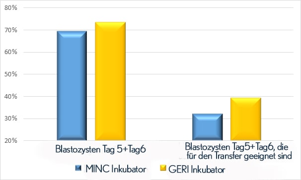 Der Unterschied zwischen den MINC Inkubatoren, die wir früher verwendet haben, und den GERI Inkubatoren bestand im vorrigen Jahr in dem um 7 Prozentpunkte höheren Gewinn der hochwertigen Embryonen am Ende der Kultivierung. Es konnte realistisch 1 oder auch 2 hochwertige Embryonen – also Transfers noch dazu bedeuten, was mehr als 20% Unterschied darstellte.