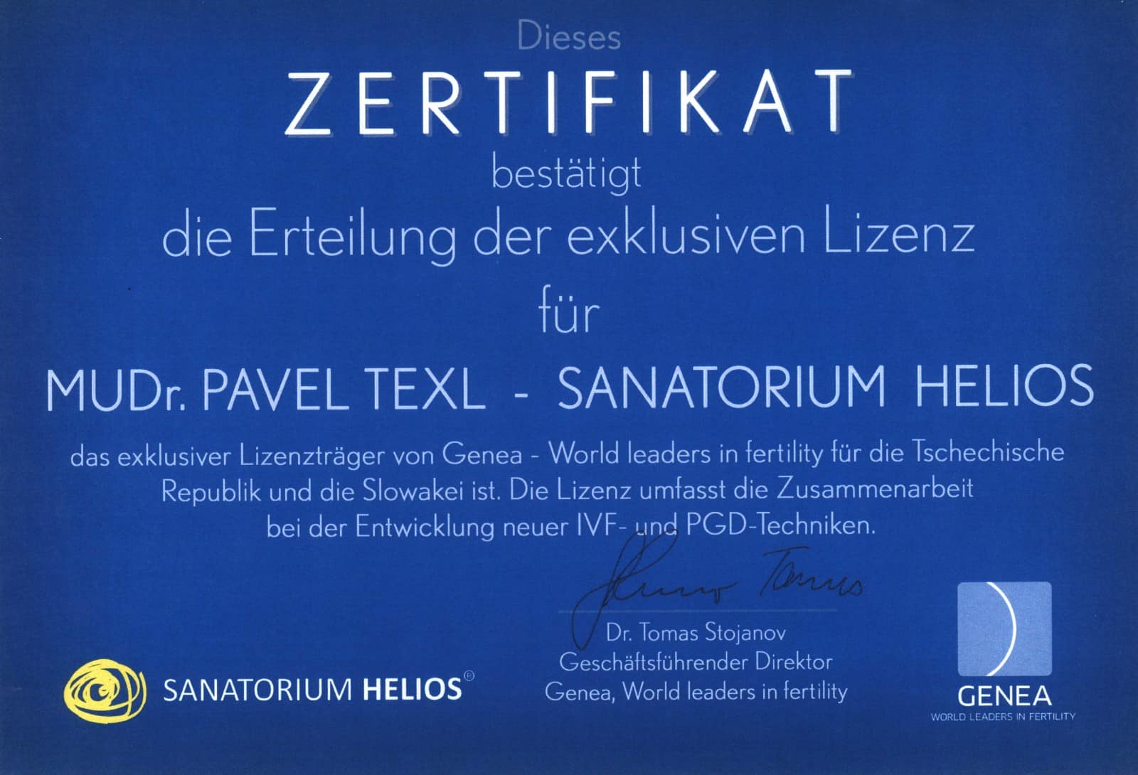 Das Sanatorium Helios erhielt als einziges Zentrum in Europa im Jahre 2002 einen exklusiven Lizenzvertrag für die IVF-Technologie vom australischen Zentrum für assistierte Reproduktion Genea – World leading fertility (früher Sydney IVF).